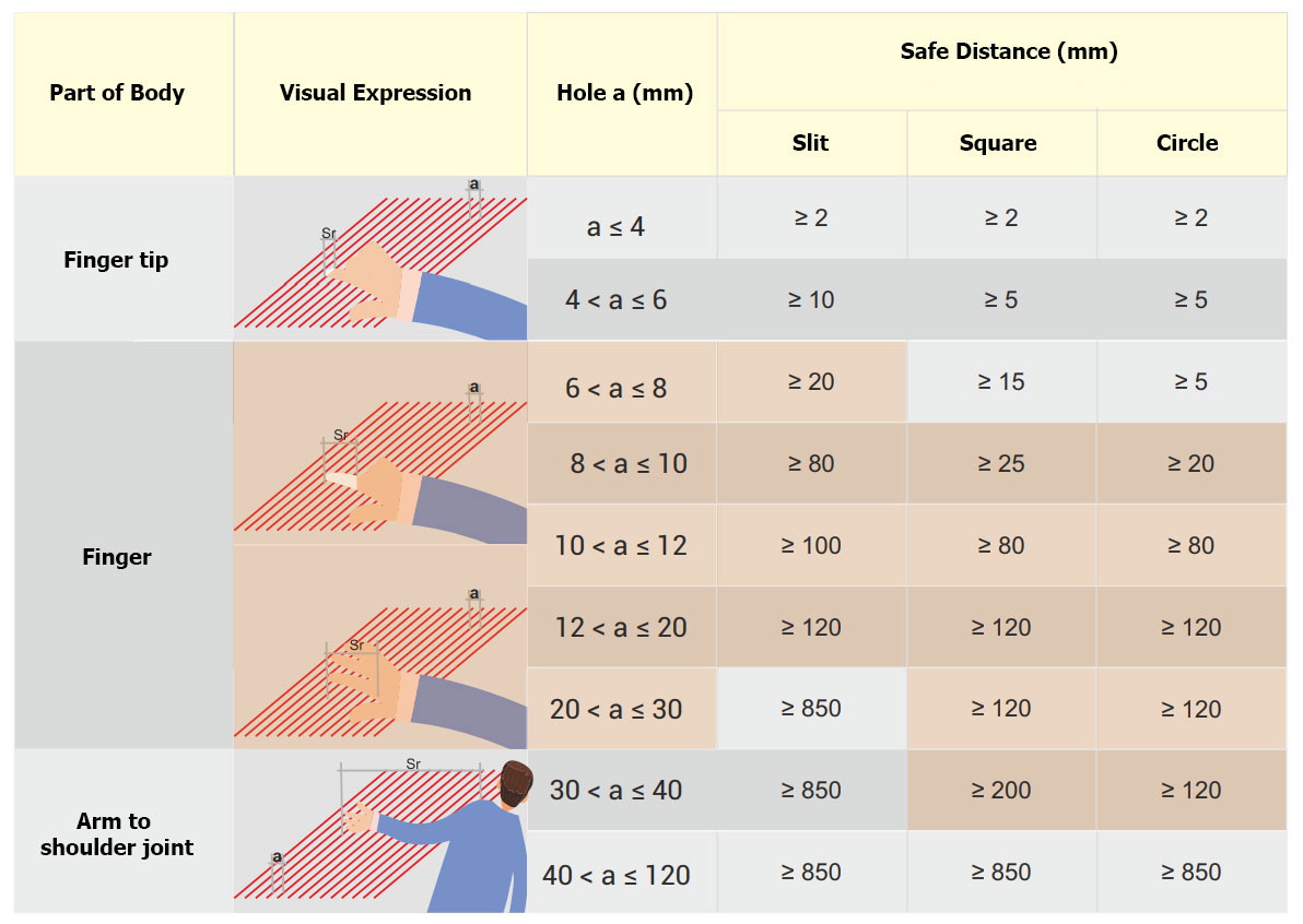 In accordance with the safety standard for machinery EN ISO 12100, Safety Fence Systems are included in the group of physical protection devices and must be evaluated according to EN ISO 14119-14120 standards. Spacings in physical protection devices, distance from hazardous areas, installation locations must be determined according to EN ISO 13855 and EN ISO 13857 standards.